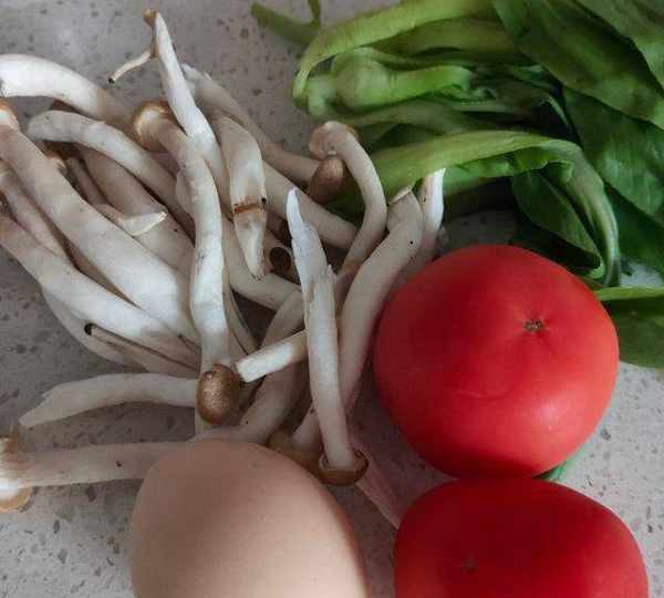第1步、食材洗凈備好:西紅柿,蟹味菇,雞蛋,油菜。