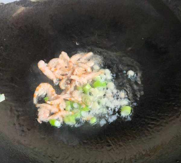 第6步、熱鍋涼油放入蔥薑末蝦米爆香。
