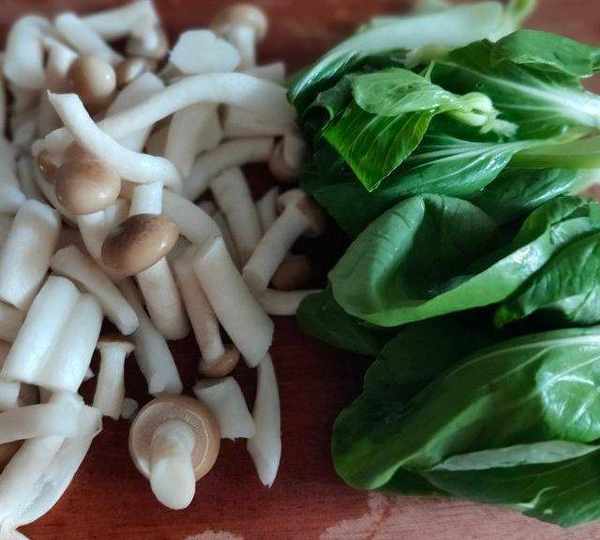 第2步、蟹味菇切成小段,油菜切成兩段。