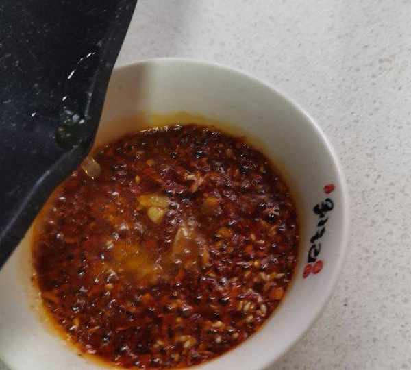 第12步、取一小碗,將切碎的蒜末放進去,裡面加鹽,雞精,辣椒粉,胡椒粉,熟芝麻將燒好的熱油倒進去。