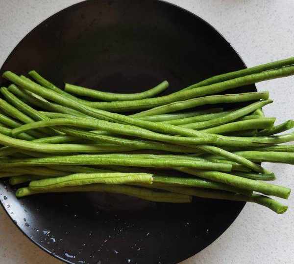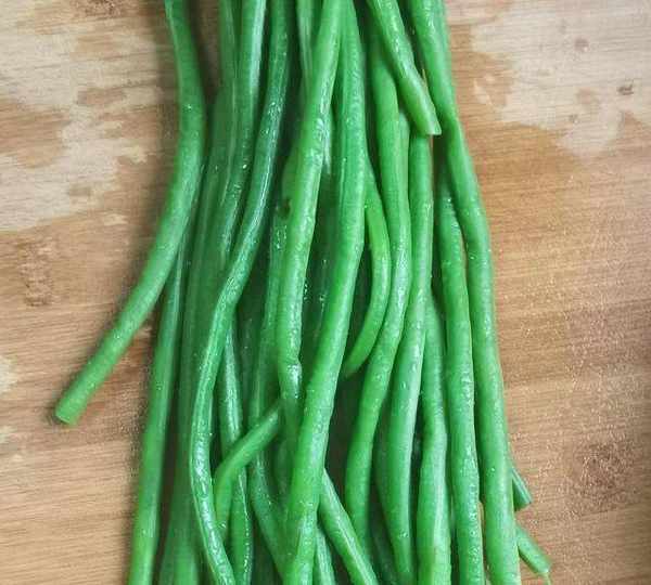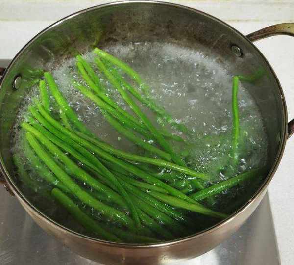 第2步、鍋中燒水,水開後裡面加少許鹽和兩滴油將豆角焯水一分鐘撈出過冷水瀝幹水分。