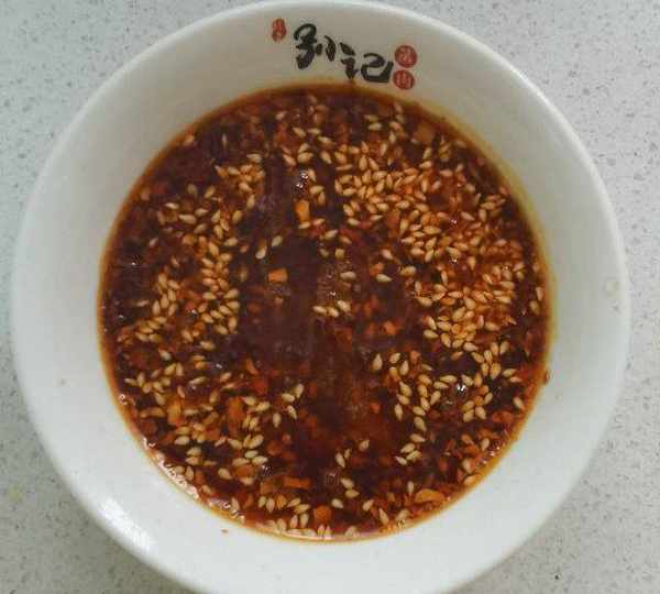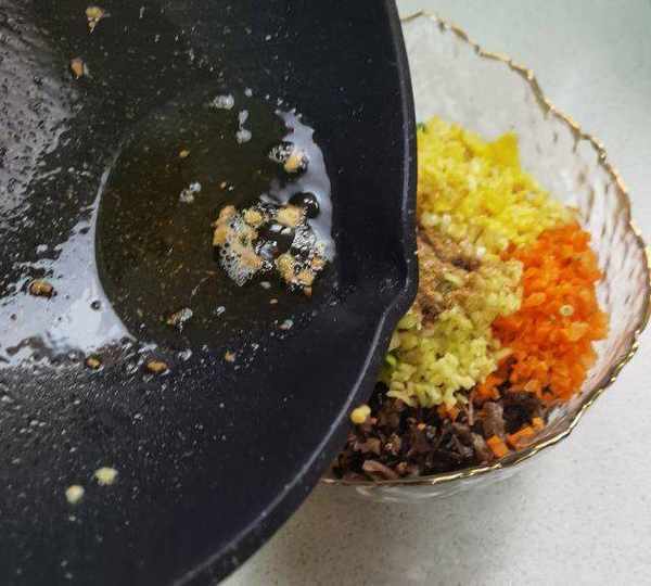 第10步、起鍋燒油,油冒煙時淋在調料上面,加芝麻油攪拌均勻。