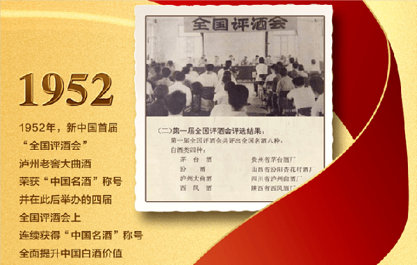 1952年,第一屆全國評酒會在北京舉辦,百廢待興的時代,這一評酒盛會的召開為中國白酒產業振興吹響瞭號角。瀘州老窖酒作為濃香型白酒的典型代表,獲評“中國名酒”,以“瀘香型”之名被載入中國白酒史冊。