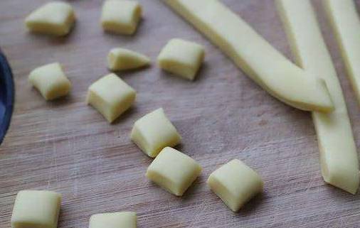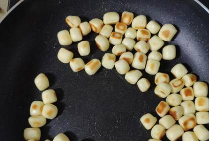 第2步,接著把醒發好的面團放到砧板上,用手揉搓成長條狀,再切成一個個小面團,為瞭讓小饅頭擁有好看的外觀,可以稍微用手修整一下,再往面團上撒上一層幹面粉,然後準備一個不粘鍋,把小饅頭胚子放到鍋中,轉成小火慢煎,直到表面金黃為止。