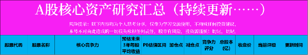 另外我做瞭下面這張表,A股核心資產研究匯總的表格,裡面精選瞭上百傢優質的龍頭公司,並附數萬字的分析方法。