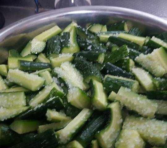 2、黃瓜可以切成條,也可以切成小段,看大傢的喜好瞭,但是一定要用鹽殺水,像我一次做10斤的話,一般用一袋子鹽來殺,而且拌均之後上面壓上重物,我是直接接瞭一鍋水壓在上面,這樣能使黃瓜裡的水分盡可能的被擠壓出來,做出來的黃瓜才會更好吃;