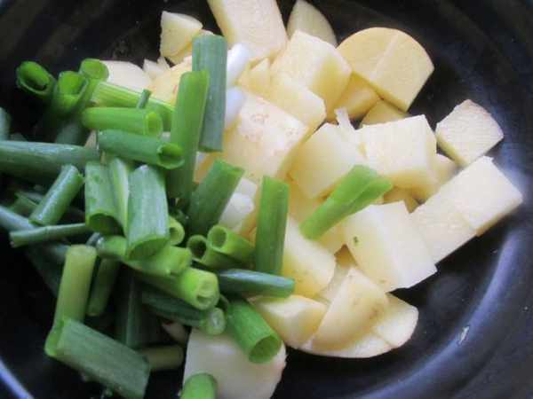 第一步:小葱切段,洋芋去皮切塊。秋天正是洋芋大批上市的季節,東北的洋芋味道和口感都很不錯。