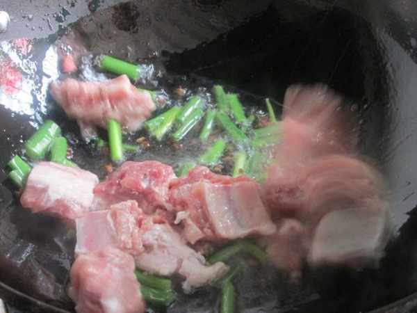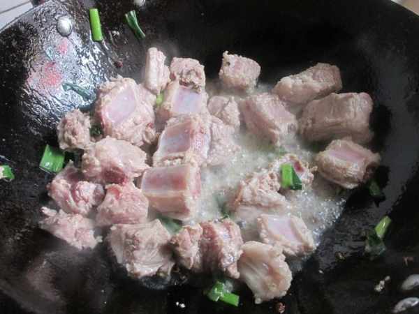 第三步:鍋裏放入花生油,入葱薑爆香,倒入排骨煸炒。