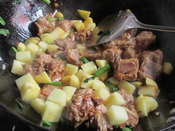 第五步:然後加入醬油炒勻,再倒入洋芋煸炒均勻加鹽調味。