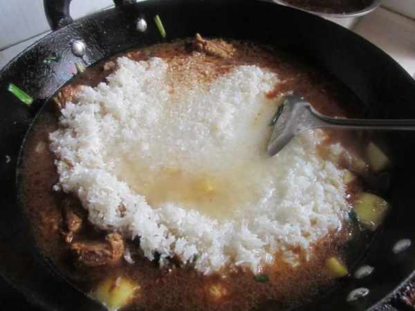 第六步:倒入適量的水,再倒入大米,翻拌均勻大火燒開鍋。