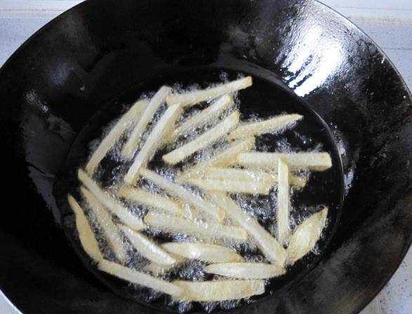 土豆瀝幹水分後裝袋保鮮,放入冰箱冷凍。達到24小時的冷凍時間後,取出土豆打冰沙,準備一盤面粉,將土豆放入面粉,讓每個薯片都沾上面粉。鍋內倒入適量的油,大火將油加熱至50%,將土豆條放入鍋中,待土豆條兩面微黃時撈出繼續加油。平底鍋。燒熱,油70%熱的時候,把土豆倒進煎鍋裡,炸的時間不要太長,大概30秒左右,薯條焦黃後就可以撈出瞭。