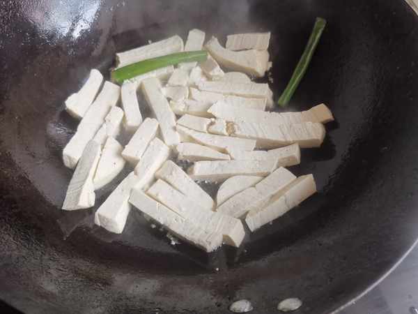 先把鍋燒熱,放入適量的花生油,放入豆腐小火煎制。