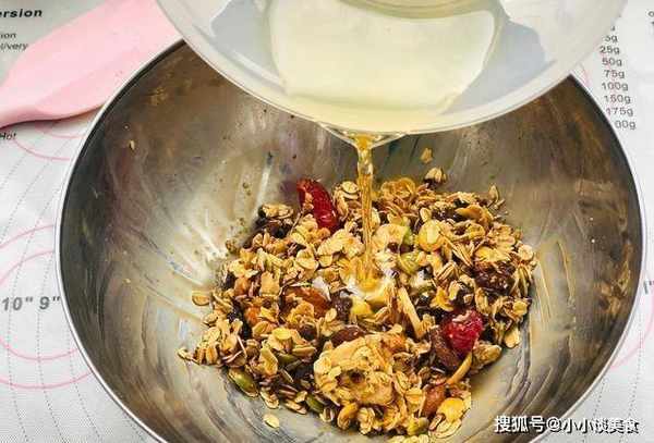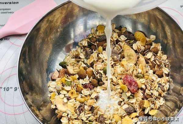 準備一個幹凈的大碗,配料裡面都提到瞭食材,其實都是一般的食材。先把水果燕麥倒入水果中,松散的加入紅糖和鹽,適量即可。然後加入適量的調好的牛奶,倒入牛奶後攪拌均勻。燕麥片和紅糖吸收瞭牛奶中的水分,慢慢變成糊狀。