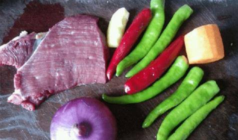 準備食材:牛裡脊半個,洋蔥一個,青紅椒一個,各種傢用調料適量