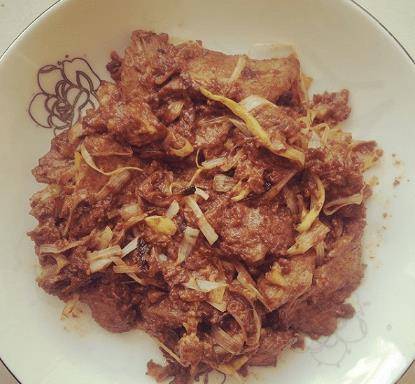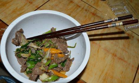 4:鍋裡放少許油,然後加入洋蔥和青紅椒塊炒至半軟,然後把肉倒進鍋裡翻炒幾下,所有的材料一定要熟。