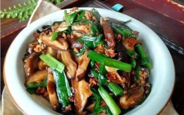 原料:鮮香菇300克,韭菜1把,豬肉100克,油、鹽適量,薑1片,蒜2瓣,醬油1湯匙,料酒1湯匙
