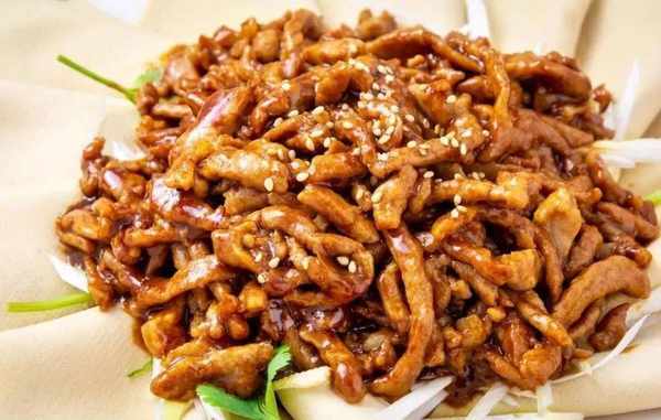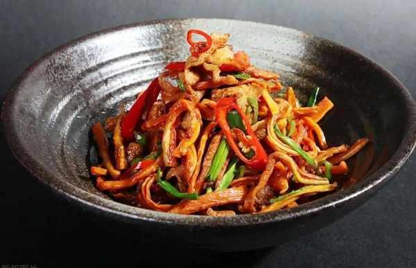 把優質鮮嫩無骨的瘦豬肉切成絲,放盆內加入少量鹽、料酒、味精、蔥薑末、雞蛋清、水、淀粉拌勻。鍋內加水燒開,把拌勻的肉絲均勻地撒入。等肉絲呈白色時,用漏勺撈起放入冷水中浸涼,控凈水分待用。