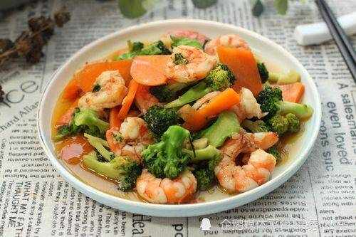 3、鍋裡留底油,下入蔥薑蒜末爆香,倒入西藍花、胡蘿卜片,大火翻炒一會兒,熟透後加入食鹽、蠔油、胡椒粉調味,倒入炒好的蝦仁翻炒均勻,淋入水淀粉勾芡,湯汁濃鬱後即可出鍋。