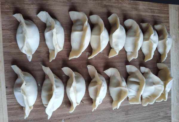 4、將餃子餡放在面皮上,隨心包好。包好所有東西後,放在一邊備用。