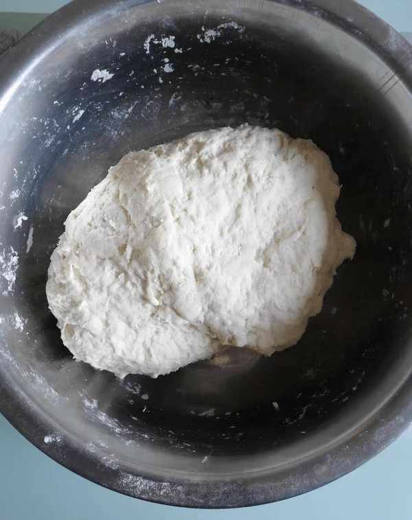 3、和好面團後立即將面團揉成光滑的塊,揉成小條,然後切成大小均勻的劑子,壓扁搟成小塊。