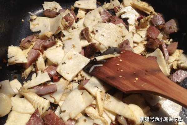 4、隨即放入切碎的冬筍,和臘肉一起炒至生,加入鹽和雞精等入味後裝盤。