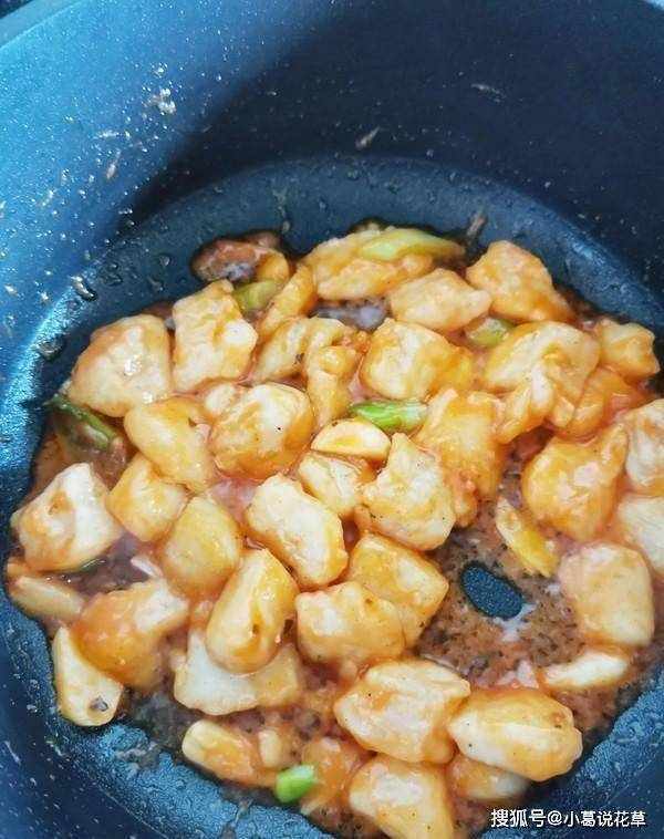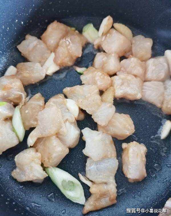 3.鍋裡放2湯匙油,當油溫為70%時,加入蔥薑蒜爆香,然後加入醃制好的魚片,不斷翻炒至生