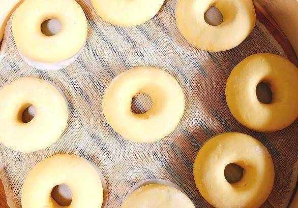 緊接著,在案板上撒些面粉,把發酵好的面團放在上面,揉光滑,分出少量均勻的大小,揉成圓形,然後在中間挖個洞,然後墊上蒸佈蒸鍋,把甜甜圈放上去,不要開火,醒半個小時左右,上面刷一些蛋液,可以加入自己喜歡的食材,大火蒸10分鐘左右。出鍋後就可以吃瞭,非常好吃。