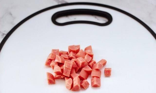 3、火腿腸去掉外殼後,用刀切成小方塊。