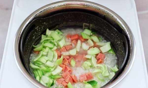 10.煮40分鐘後,開蓋。鍋裡的稀飯又稠又軟。同時,加入切丁的火腿和青菜莖,蓋上鍋蓋繼續煮5分鐘。