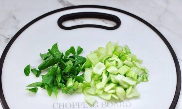 4、青菜采摘洗凈後,用刀切碎,註意區分根和葉。