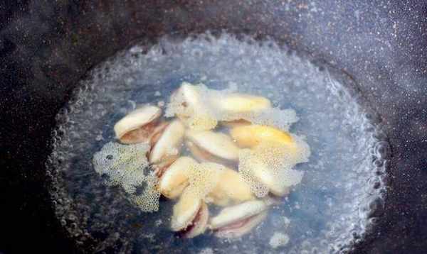 5、鍋中倒入適量的水燒開,倒入料酒和適量的鹽,將解凍後的青口焯水,撈出瀝幹。