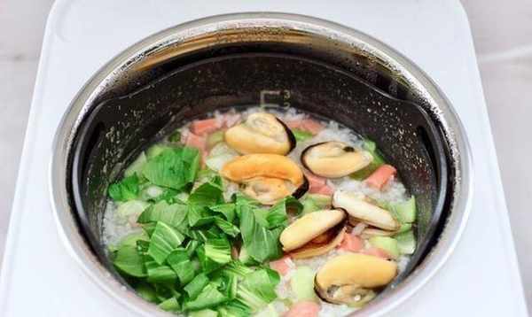 11.再次打開蓋子,加入焯過水的貽貝和青菜葉。
