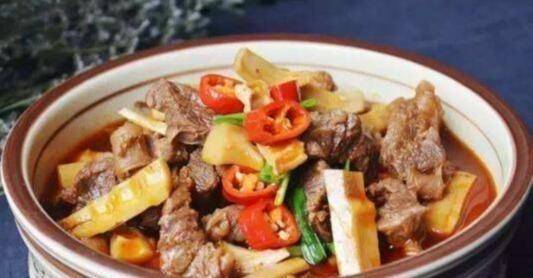 3、燒開後加入鹽;倒入煮熟的牛腩,攪拌至汁液稍少;出鍋前淋少許醬油;米汁辣牛腩是鍋裡的。