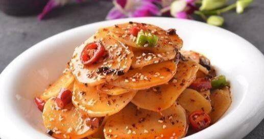 4、將煮好的土豆片取出,立即放入冰水中降溫,然後撈出瀝幹,拌入調料,裝盤,撒上蔥花和白芝麻