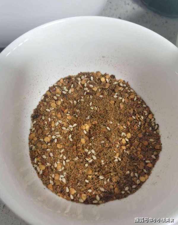 2.將孜然粉、辣椒粉、花椒粉和白芝麻混合(自制燒烤粉)