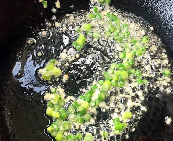 9.鍋中放入底油加熱加入蒜末爆香,再放入蒜苔粒翻炒至變色