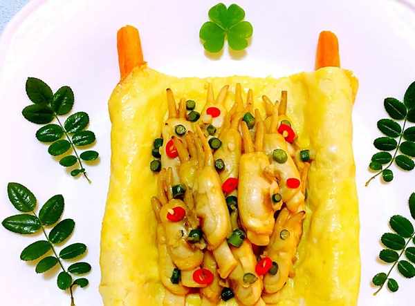 12.將炒好的美味蟶子擺入蛋皮書上