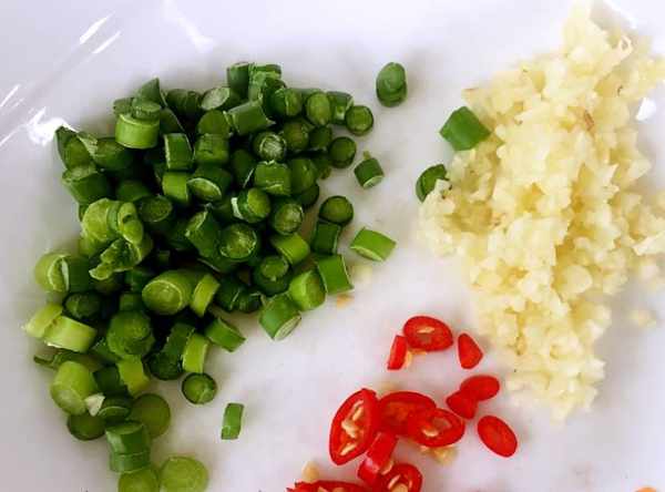 8.蒜、蒜苔、紅辣椒切碎末備用
