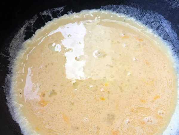 4.不粘鍋倒入適量玉米油加熱後倒入蛋液中小火煎制