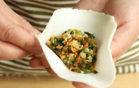 依次把包子皮全部做好。取一張包子皮,中間放上餡。拇指按住一邊往裡拿著一邊轉。