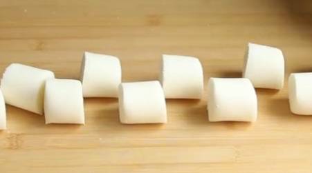 案板上撒點淀粉,把淀粉團取出,再揉一下,然後搓成長條。切成大小均勻的劑子。