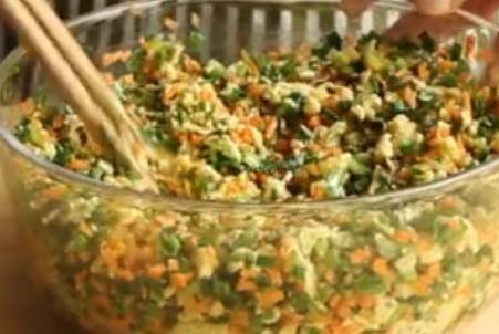 鍋裡加油,燒熱,倒入蛋液用筷子不停的滑炒,炒好後裝進碗裡。韭菜切碎,胡蘿卜切碎,都裝進碗裡,加胡椒粉,攪拌均勻。