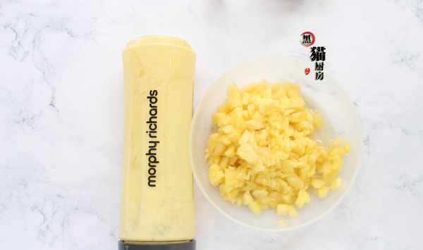 做法:1.取一半的鳳梨切成小粒,另一半放入攪拌機內打成果泥。