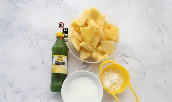 材料:鳳梨600克,白糖60克,玉米淀粉30克,檸檬汁少許。