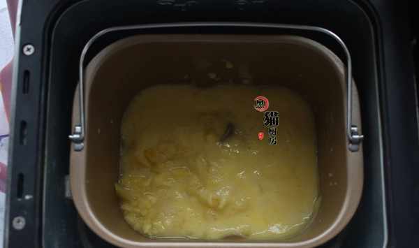 3.把打成果泥的鳳梨和切成碎粒的鳳梨果肉連同玉米淀粉水一起倒入面包機內,啟動自制果醬的功能,用面包機做果醬時間大概是1小時20分,隻要把所有材料放入面包機內,就不用管啦。