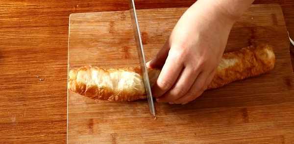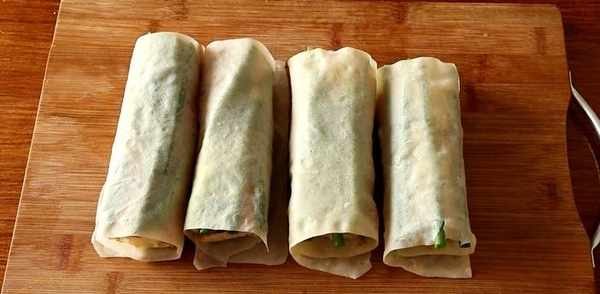 油條和蔥切小段,取一張做好的春卷皮,放上油條和蔥,把春卷皮包好。