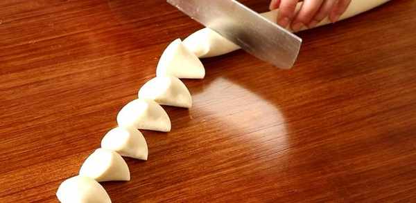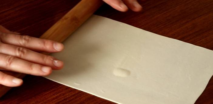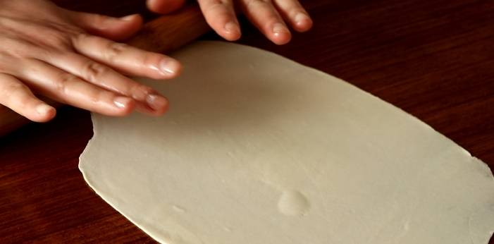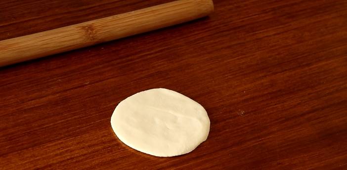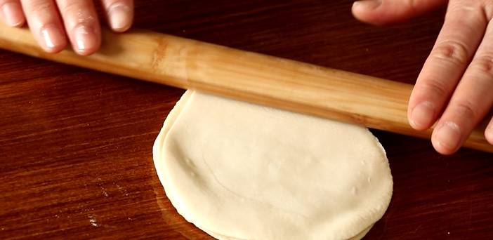 面團醒好後,取出,搓成長條,切成小劑子。取一塊小劑子,按扁,像搟餃子皮一樣把面皮搟薄。