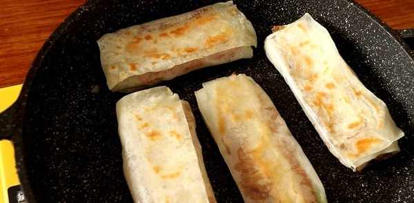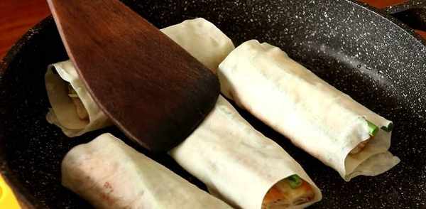 鍋內放油,把包好的春卷皮放入鍋內煎,一邊煎,一邊用鏟子壓,直到油條被壓扁,壓得很薄,外皮也變成金黃酥脆即可出鍋。吃得時候蘸著自制甜面醬,非常得香。