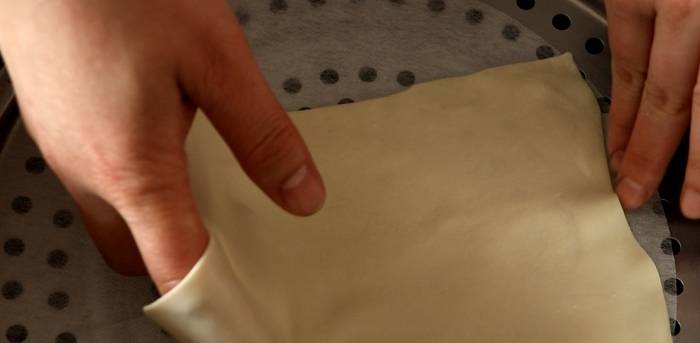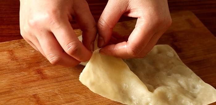 用手把皮子按扁,再用搟面杖搟薄搟大,用刀修邊,把皮子切成長方形,放入蒸鍋中蒸熟取出。把蒸好的皮子分開,撕成一片片備用,分好的皮子可以放入保鮮袋中,也可以用濕佈遮起來,或者用保鮮膜蓋著。