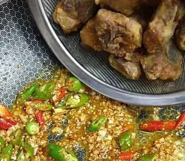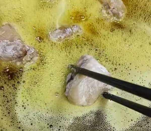 鍋中加入油燒至六成熱,然後下入排骨炸。
